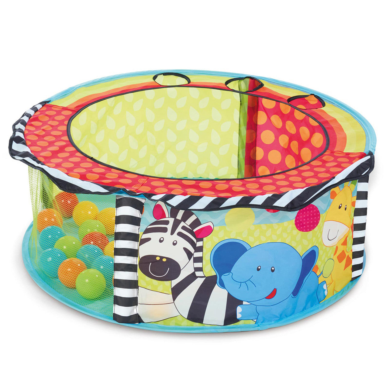 This Ball Pit is a safe and exciting place for little ones to sit, roll and play. Perfect for hands-on fun and learning games, it features 20 included colourful balls. Your child can touch the soft textures and explore ball pit. They can also learn how to post the balls for even more fun or play peek-a-boo with the mesh panels. The outside features ribbons for grasping on to for extra-interactive playtimes.
