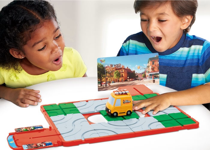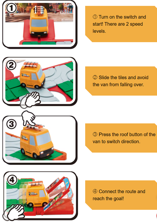 Each player is allowed to move the tiles up to 3 times during each turn. Press the button on the van and say "Route 'n GO!" to switch to your opponent's turn. If the van goes off the track, both players must restart the game. Whoever reaches the goal first is the winner.