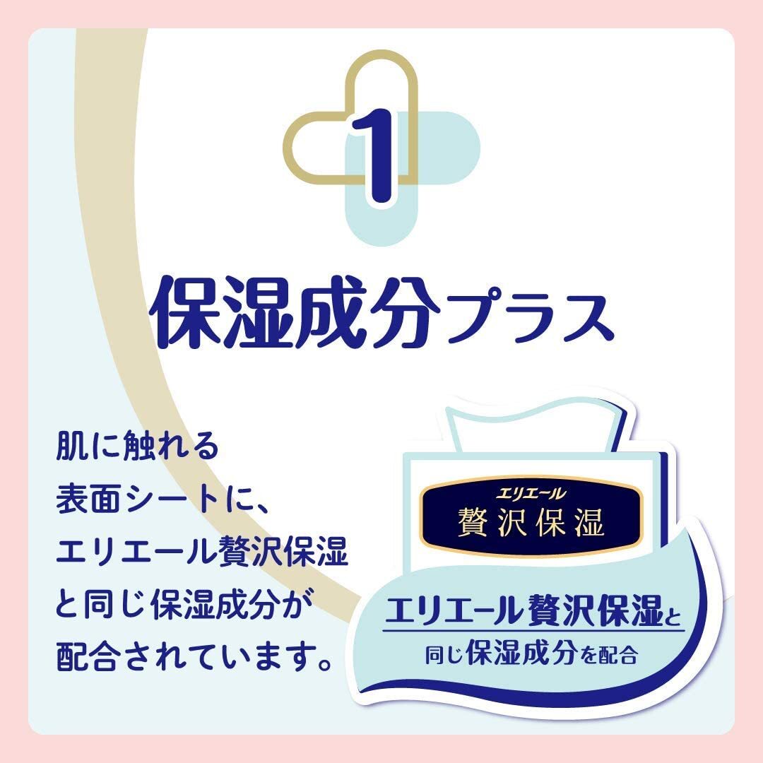 The surface sheet that touches the skin contains the same moisturizing ingredients as Elleair Luxury Moisturizing. Reduces the burden of rubbing with a smooth texture like a luxurious moisturizing tissue.